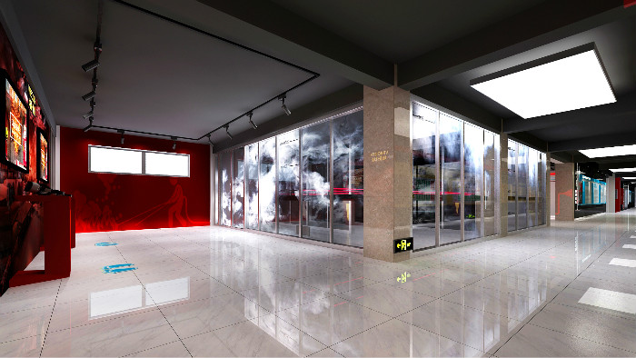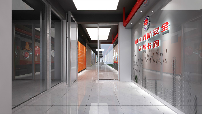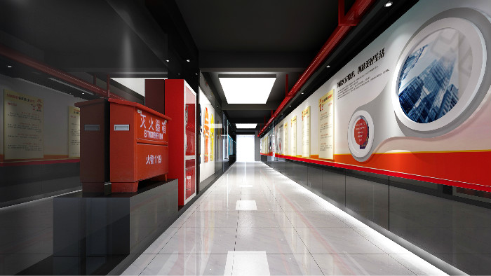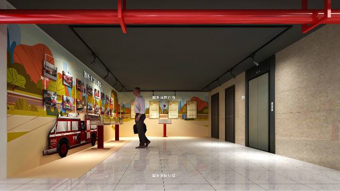空间色调:典型的红黄消防色彩为展间定下基调。展示空间的展板、导视线路以及灯光配色都采用红、黄色,使得空间的消防主题氛围更加浓厚,在消防知识展示上也更具“警示”的视觉效果。