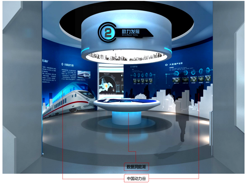 圆形吊顶和圆形展台。展区采用环绕围合形式,如洞庭湖中的岛屿。寓意在中国动力谷的大背景下,数据洞庭湖的发展与规划。