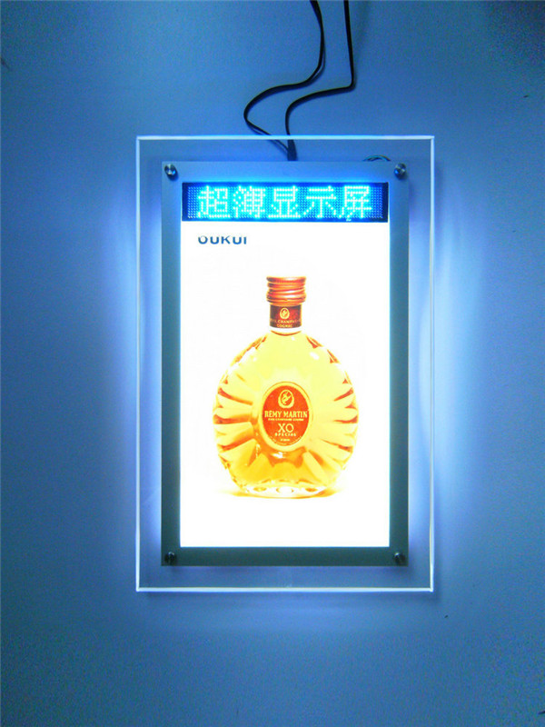 本实用新型提供一种超薄动感灯箱,主要适用于广告,包括箱体,设在箱体中的光源(5)和驱动电路(6),设在光源(5)前面的图片(8),其特征在于,在所述图片(8)前面依次设有偏光膜(3)和液晶显示器(2)。还可在上述偏光膜(3)和液晶显示器(2)之间设有用透明或半透明材料制成的具有一定形状的增强膜。该超薄动感灯箱,由于黑白液晶显示器和偏光膜设置,不但具有比较薄的箱体,画面具有一定动感,而且造价低廉,画面更换简单,适应于大范围推广使用。