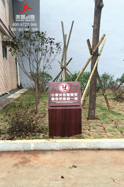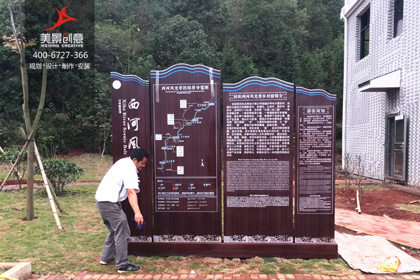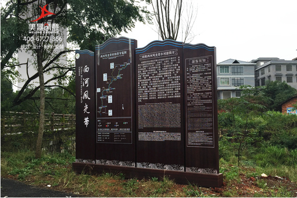 西河风光带绿草如茵环境优美,小桥流水人家,别有一番风味。为了突出环境的“绿”、“静”、“幽”,美景创意在设计过程中结合西河自身特色量身定制了以棕红色古木风格为主调的标识标牌。