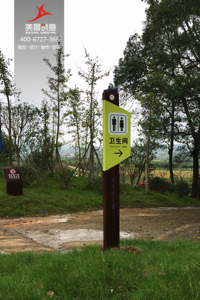 树林草地间的花草牌,别院人家前的指路牌,棕红色主体与黄绿色标牌产生的巨大色差,让标识十分耀眼,同时传统而不失活跃的设计没有破坏生态原有的美与静。可见导视系统的设计,突出设计为下等,融合环境为中等,突出环境为上等。美景创意为西河风光带设计的导视系统,你给打几分呢?