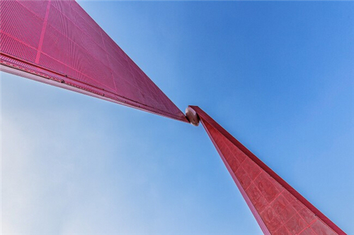 在颜色的选择上,西凤桥采用红色和木色相结合。红色象征着热量、活力、意志力、火焰、力量,而红色在中国预示着喜庆热闹,标志性和指示性都比较明确;木色象征着沉稳,温暖,给人一种返璞归真,回归自然的亲切感。凤凰的折线形体再搭配红色、木色的材质,整体营造出一种简洁、干净、舒朗、时尚的空间氛围。