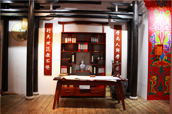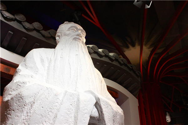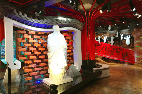 书斋对面是孔子思想展,主要包含了孔子雕塑、中华文脉墙和文化之树。
