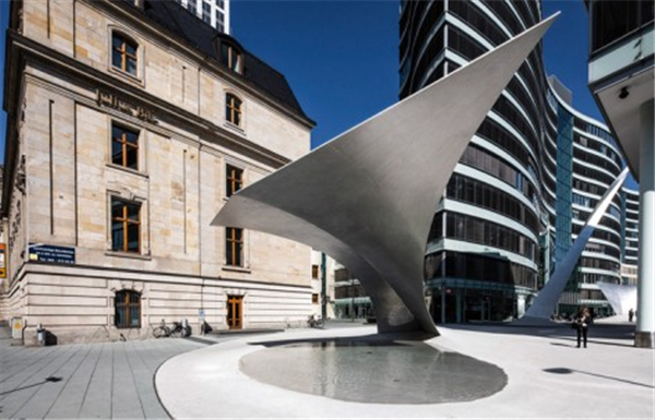 这处被称作“浪潮”的办公综合体位于法兰克福的西区,它建造于1998-2003年,由三个部分组成。与新设计的室外景观毗邻的两栋主要建筑13层高,高度达到50米。尽管坐落于中心地带,该区域却鲜少有人问津。所以设计的初衷是通过令人印象深刻的雕塑来制造吸引力并借助歌剧院区域形成城市的特色区域。正如米歇尔.舒马赫教授所说:“能够提供给法兰克福的这件独特的艺术作品与充满生气的城市空间是令人十分瞩目的。