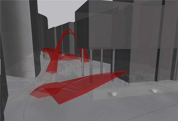 在设计阶段,拱形的形状必须满足特定的几何规律以使其能够被加工制作。因此使用参数化系统将会令从纸上的原始草图到几何形体的过程更易于实施。对材料选择的前提包括:建造成本及持续的维护成本,在工厂及现场的建造时间,以及对荷载的考虑——这座雕塑要竖立于地下停车场之上。这个项目中选择了应用于船舶及飞机制造,极度耐腐蚀的铝制材料。借助参数化系统,所需的几何造型可以轻易的结合此种材质。