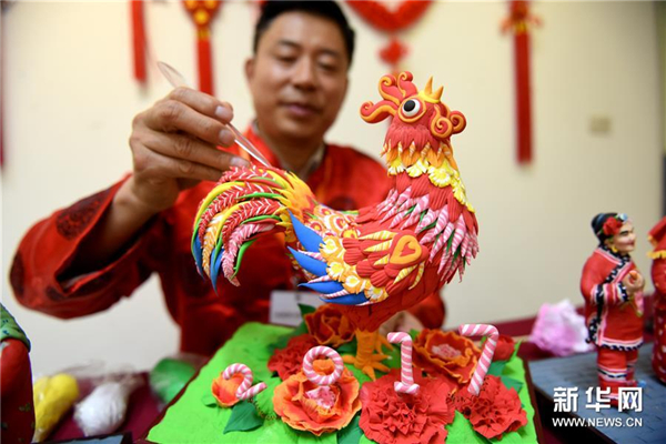 1月7日,山东非物质文化遗产传承人穆绪建现场制作以丁酉鸡年为创作元素的面塑作品。