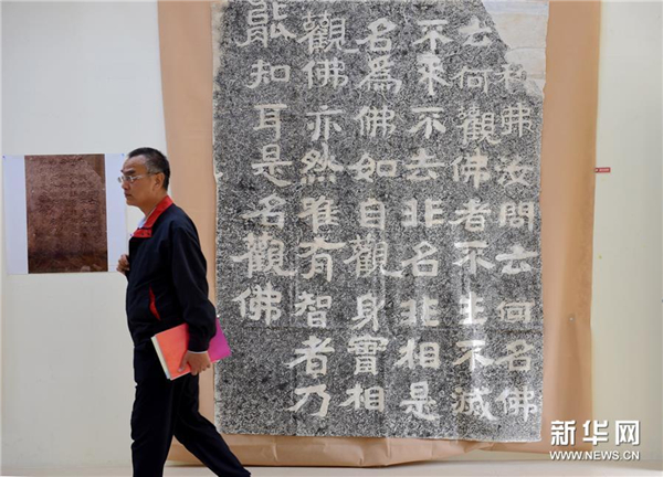 1月7日,观众在参观山东北朝摩崖刻经拓片展。