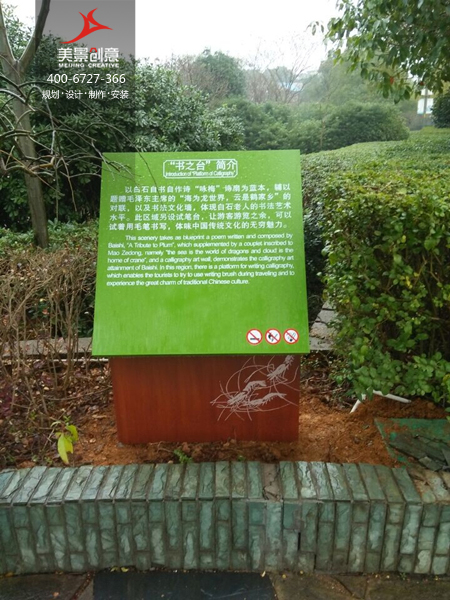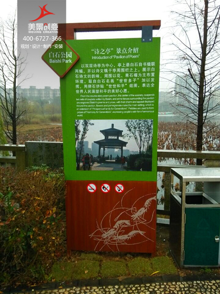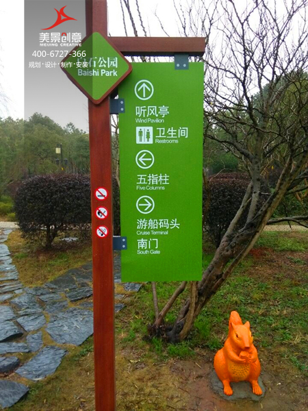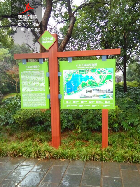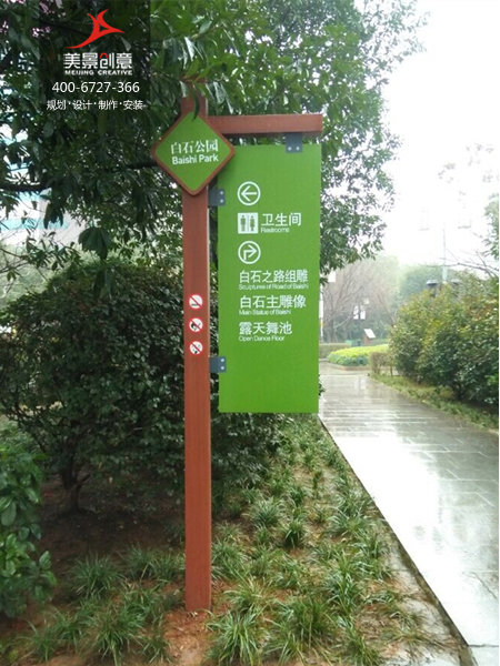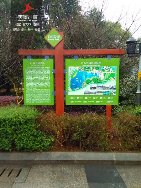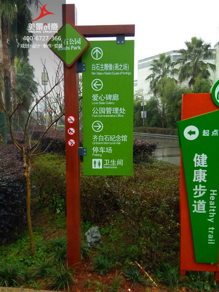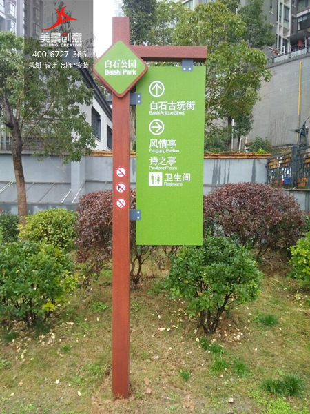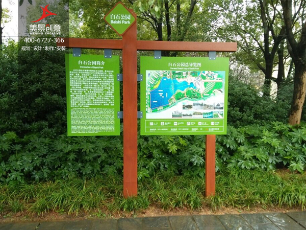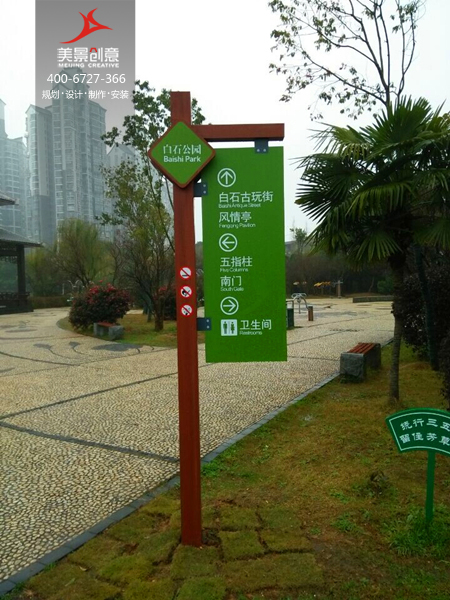 湘潭白石公园导向标识牌由美景创意设计制作,以棕红色和绿色为主色调互相搭配,完美契合白石公园自然景观,材料主要为亚克力,造型朴素而不乏活泼,为公园的整体感官提升了一个档次。