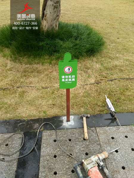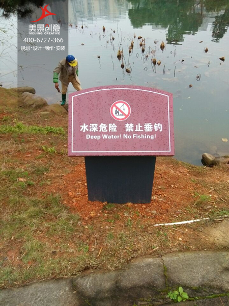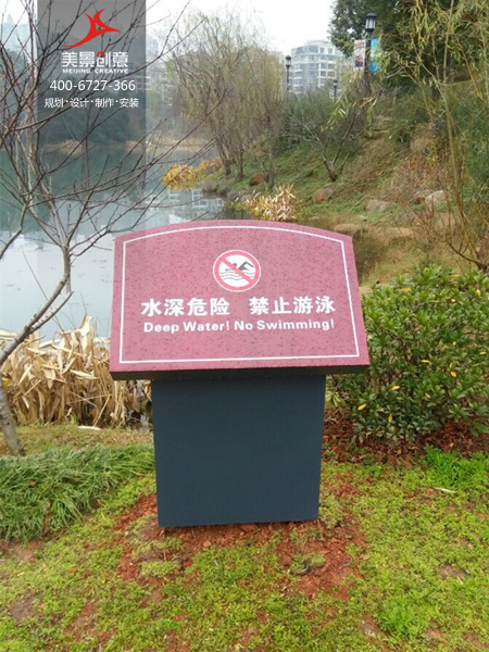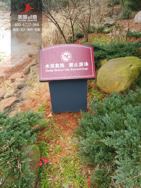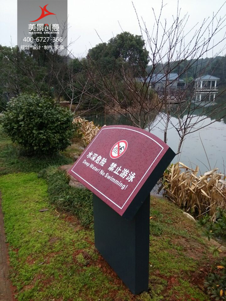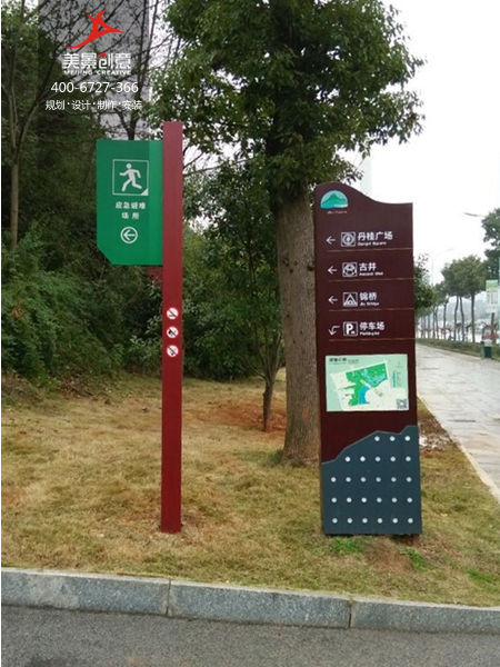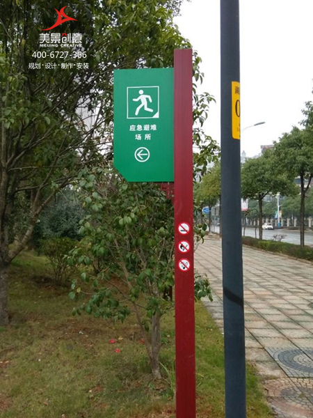 美景创意在设计湘湖公园标识系统的时候充分使用了环境与色彩的原理:环境标牌用浅绿色,警示牌用深红色,紧急避难标牌用深绿色,多向指示牌用棕红色配色,既分别了不同功能的指示牌又不显得冗杂繁复。标牌多以亚克力材料为主,选址错落在公园各个重要路口路段以及湖边显眼位置,为公园游客提供了极大的方便。