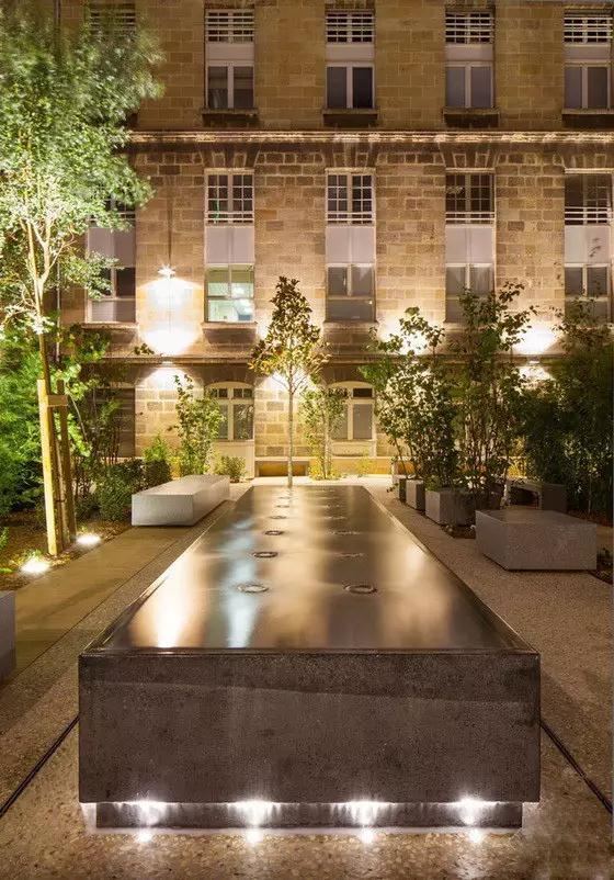 波尔多大学休闲区域的渠道水景,汩汩流动的水屏,赋予刚性石材以柔性特征。刚柔相济,活化了林地,夜晚与灯光交相辉映,营造出一个亦动亦静学校往来空间,成为人们放松休闲的场所。
