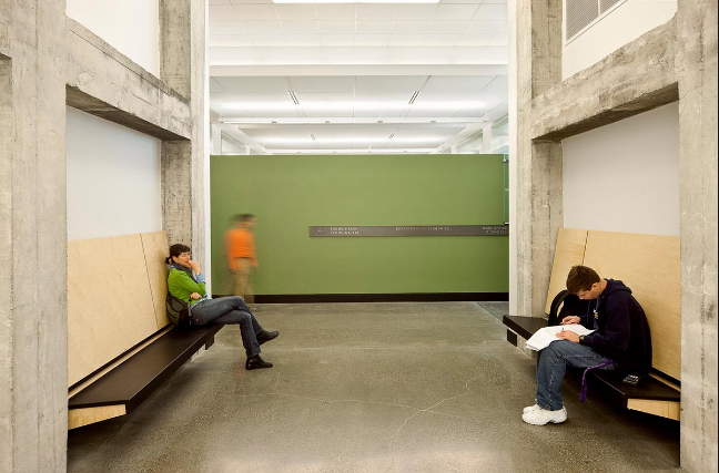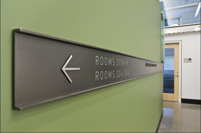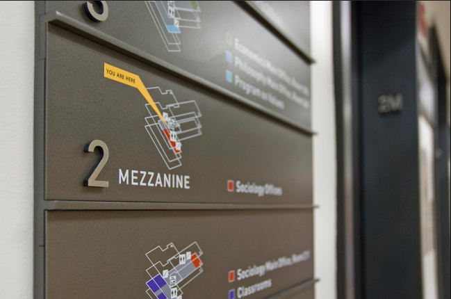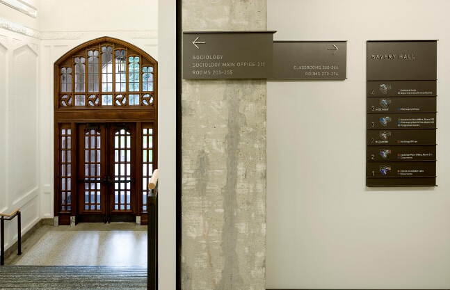华盛顿大学萨弗里大厅标识标牌设计的目的是为了对历史文科四合院里90年的校园建筑进行修复改造,重新规划了新的标识系统和导视系统,反映了新暴露的内部结构的产业特征和纪念建筑的历史。