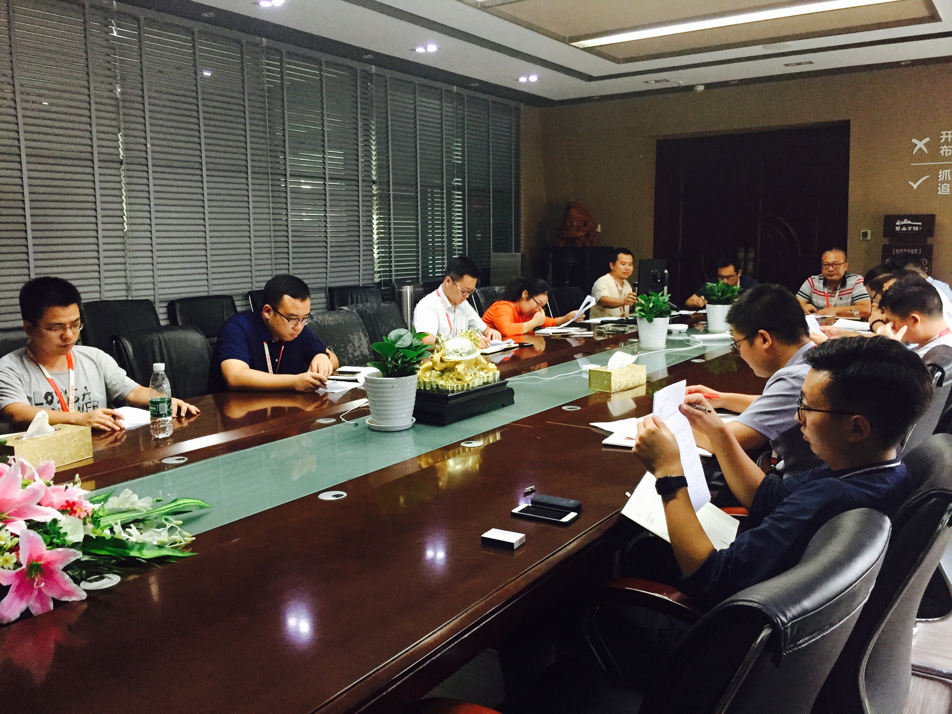 随后,总经理廖知心肯定了装修设计过程中领导班子和设计师团队的努力,并就VI系统、考察学习、文化内容建设等方面进行了宏观调控。廖总进一步指示,即日起由设计副总夏令令负责VI工作、向老师负责进行产业大楼的文化建设策划。同时廖总认为,应当将招募合作伙伴提上工作日程,共谋美景的新发展、新征程。