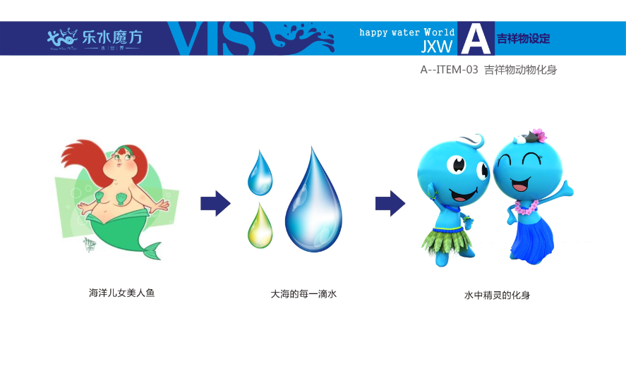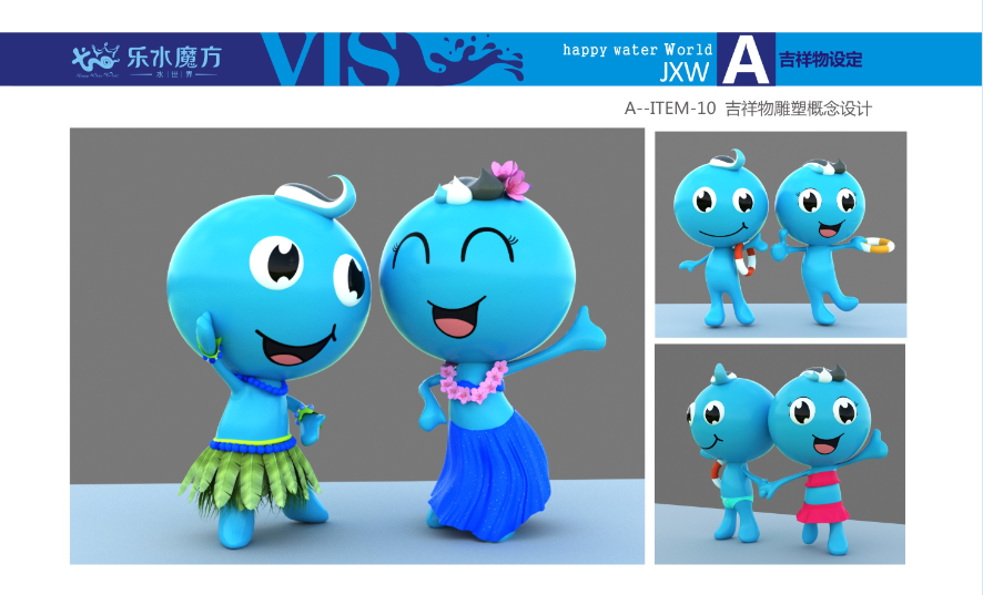 确立方向后,开始策划乐水魔方的中心概念:“欢乐水世界,嗨浪新魔方”,在展开吉祥物设计时, 创意总监向严龙 亲自操刀,另辟蹊径,结合“水中精灵”的文化故事和“风起云聚灵、云化雨落地”的自然美景,设计出了两只美丽的精灵宝宝。精灵宝宝又暗喻着来水上乐园游玩的孩子,营造出欢乐、热情的乐园气象。