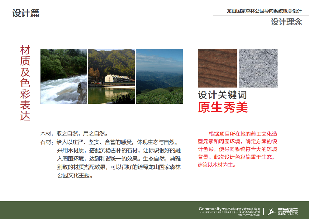 结合娄底涟源市地理自然环境,美景创意的导向系统在设计上融入了环境,从自然的丘陵地貌、人文景观、建筑中提取材质色彩。考虑亚热带大陆性季风湿润气候原因,尤其重视标识选材与工艺处理,将景区自然的石材、自然的色彩融入到了导向系统中。龙山国家森林公园以自然生态为核心,导向系统的设计也以此为着力点,分析生态文化的特色元素,并运用到设计中来。