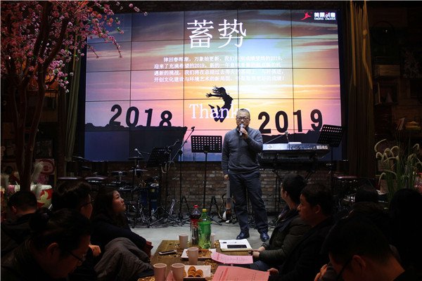 回望2018,展望2019,设计中心的年度总结应时展开,不过今年的年度总结可以说是情怀满溢。富有青春气息的梅溪湖胡桃里酒馆,民谣音乐轻快地游荡,舞台下三条长桌上,挤挤挨挨的是美景创意设计中心的小伙伴们,大家亲切地聊着天,比往常多了一丝活泼气氛,多了几分轻松意味。