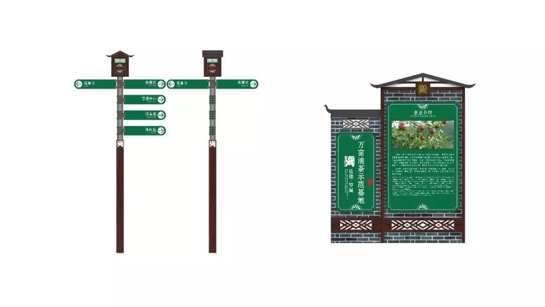 在元素提取上,我们提取具有当地民族特色的仫佬族传统纹饰,选用贴和罗城本地传统建筑的色彩元素,对油茶示范基地导向系统进行设计。在材料选用方面,考虑到当地的亚热带季风气候,依据抗酸碱度、耐腐蚀、高硬度的原则,我们斟酌选用了高防腐特性的制作材料和加工工艺。