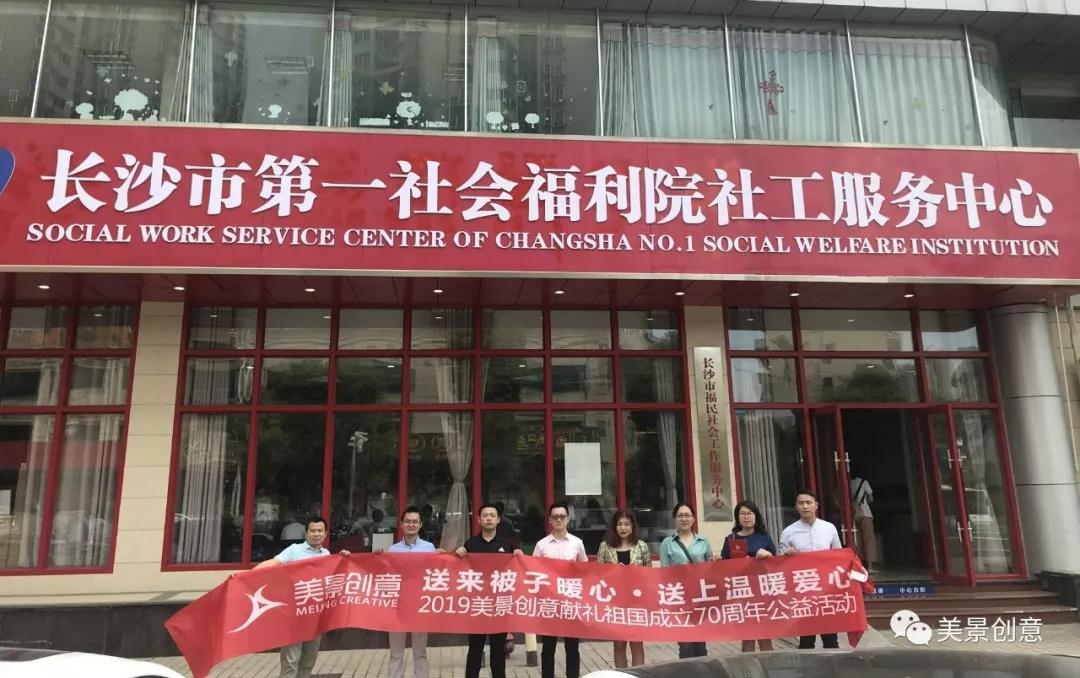 时值祖国母亲70华诞,更逢九九重阳佳节,美景创意的党员队伍带着一片温暖心意前往长沙市第一福利院。在热心的工作人员接待下,美景创意爱心小队顺利完成了80 床棉被的捐助,并跟随工作人员对福利院的老人们展开慰问。