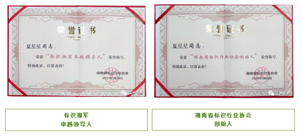 热烈祝贺公司及董事长荣获“湖南省标识行业协会创始单位、创始人”及“标识湘军卓越企业、卓越领导人”荣誉称号!